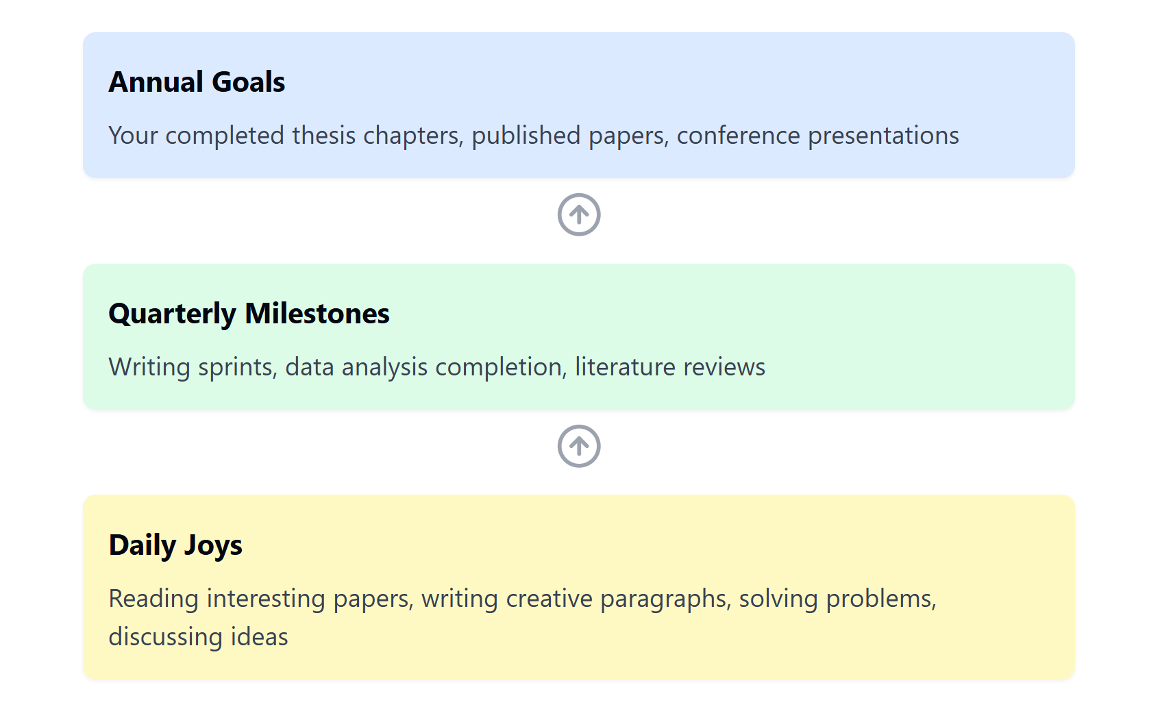 Just as every epic game has a final level, every academic year needs its big picture goals. Those conference deadlines still need to be in your 'feel good calendar'. But here's where this bottom-up approach is helpful - by focusing on daily joys and quarterly quests, the annual achievements often emerge naturally, like levelling up in a game. I love a natural approach to systems, because its a much more organic way to grow.