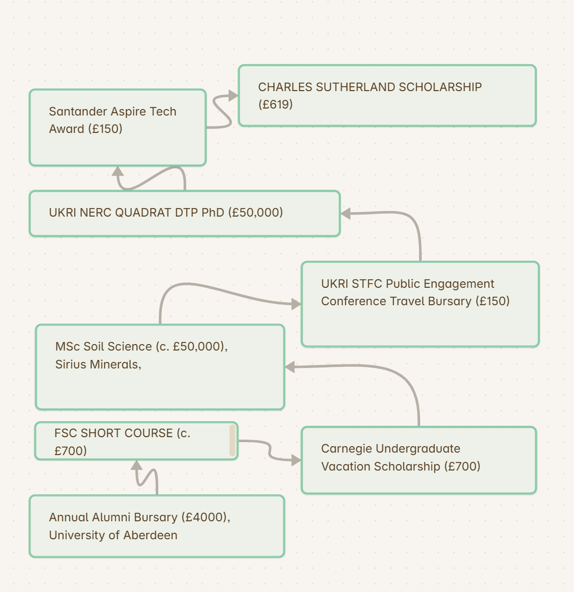 This idea has remained with me and I keep a document with my building blocks of funding I have applied for and received over the years since my undergraduate degree. I didn’t think I was particularly proficient at getting funding, but now that I have mapped it out, it makes me feel a lot happier and more confident for applications in the future. I can see how things build together despite this process starting all the way back in 2004.