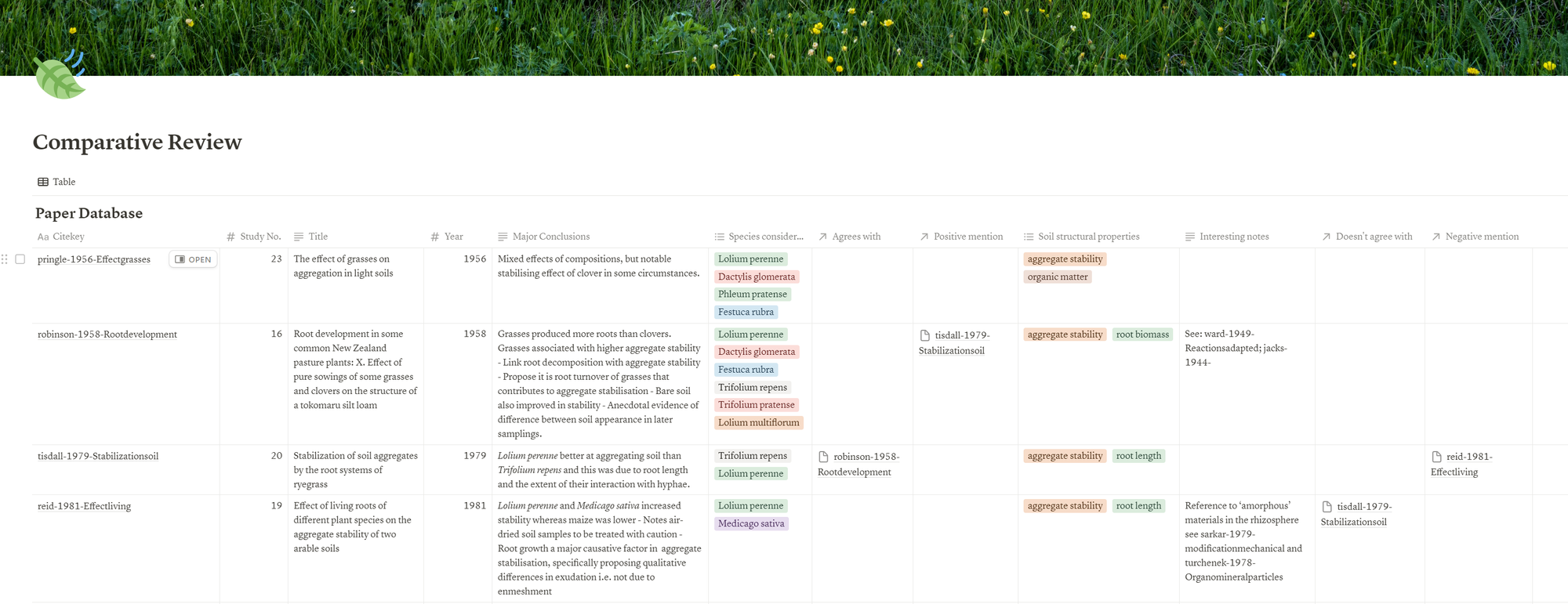 As an example, we'll look at the comparative review I'm working on at the moment - plant species effects on soil structure - it's perfectly defined for a table. Given the nature of how I'm doing the analysis bit of the review, I have a defined set of papers, and some fairly defined information to get from them. So I have started with that.