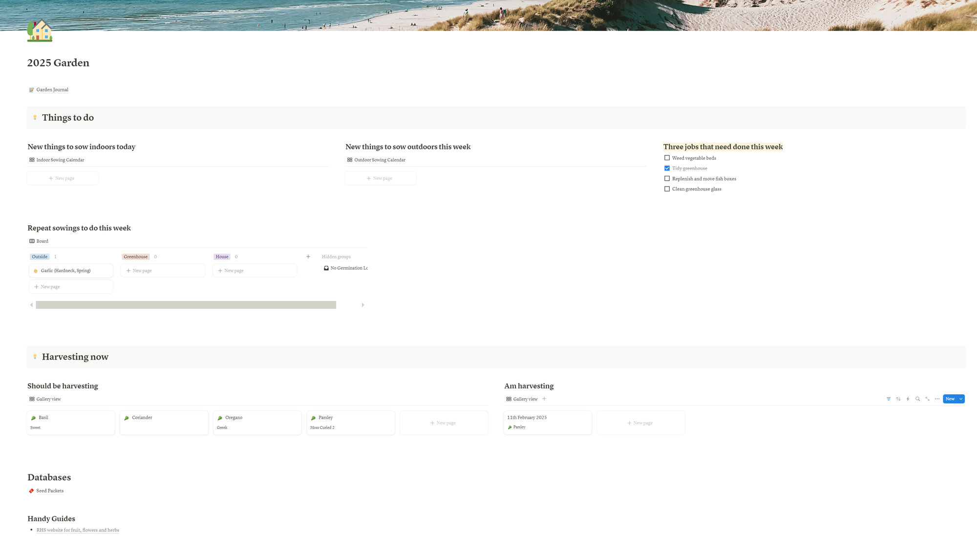 I've set up a 'should be harvesting' table so I can see, if I was on the ball, what I could be harvesting right now, and how that compares to the one on the right. And this is where I get annoyed, because kale should be showing up in there too. But because of how the Notion calendar works, the current 'harvest dates' I have set are for 2026. Then I wonder, should I change harvest date to a categorical 'harvest month'? That would solve that problem yet make another; there would be no time aspect associated with them. I going for what I should sow on a date relative to today is more powerful than what should I sow in January specifically. And by using dates, I can better keep tabs on how long things take to grow here, which is like 25% longer than the warmer UK south.