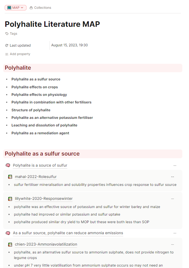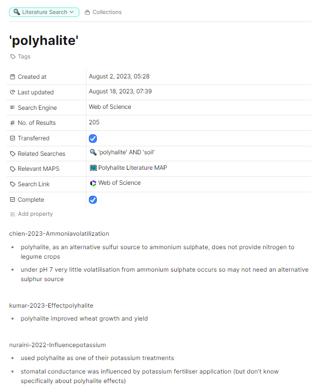 Below the metadata, for each relevant result, I put the Better BibTeX citation key I use throughout any reference work; first author-year-first two words of the title. Under this I put 1-3 bullet points of the major results derived from the abstract of the paper; we're talking really basic level findings here. Under 'kumar-2023-Effectpolyhalite' you'll see all I've written is 'polyhalite improved wheat growth and yield.' I'm sure there will be nuances within that result once I go ahead and read the paper, but for now, the big story is polyhalite had a positive impact on a crop.